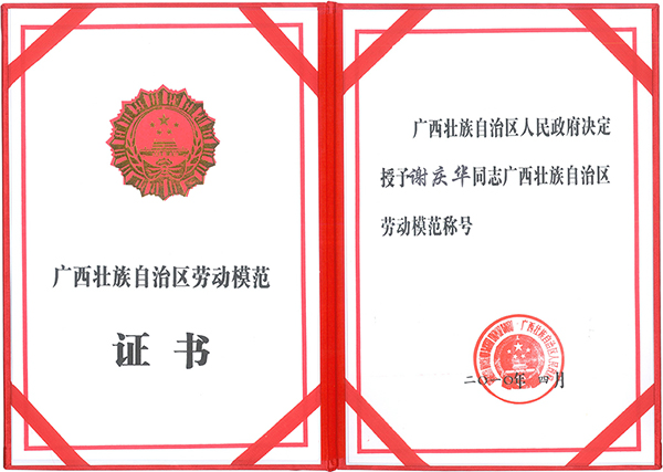 謝慶華總經(jīng)理榮獲“廣西壯族自治區(qū)勞動(dòng)模范”稱號(hào)