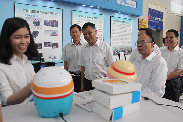 在園區(qū)展示廳,于春生聽取了北海工業(yè)園區(qū)管委會主任朱會東對北海市打造千億元電子信息產(chǎn)業(yè)規(guī)劃,中國電子北海產(chǎn)業(yè)園發(fā)展進程匯報以及下一步以信息服務(wù)業(yè)為主導,以智能硬件和創(chuàng)意設(shè)計為重要支撐產(chǎn)業(yè),政企聯(lián)合共建中國電子北部灣信息港的規(guī)劃介紹,陪同參觀了園區(qū)長城能源、冠捷科技、三諾電子等企業(yè)產(chǎn)品。在園區(qū)企業(yè)三諾電子產(chǎn)品體驗區(qū),饒有興趣的聽取了工作人員對新穎的數(shù)碼音響產(chǎn)品演示及介紹。在創(chuàng)業(yè)成果展示區(qū),于春生觀看了園區(qū)管委會、科技局、產(chǎn)業(yè)園三方合作共建的北部灣孵化器創(chuàng)業(yè)企業(yè)科遙奇智能機械手演示,聽取了蘊芯科技電子芯片產(chǎn)品專利技術(shù)介紹、產(chǎn)品銷售及推廣,了解了會圈紅包的互聯(lián)網(wǎng)+營銷模式,鼓勵創(chuàng)業(yè)青年以市場為導向,結(jié)合自有特色,抓住產(chǎn)業(yè)發(fā)展機遇做大做強。當于春生得知科遙奇、海云智慧等好幾家創(chuàng)業(yè)企業(yè)在國家、自治區(qū)一級創(chuàng)業(yè)大賽上榮獲嘉獎,蘊芯科技、瀟鳴進出口貿(mào)易等企業(yè)產(chǎn)品訂單源源不斷暢銷國內(nèi)外市場時,于春生對園區(qū)發(fā)展電子信息制造業(yè)的同時,重視中小微企業(yè)創(chuàng)業(yè)創(chuàng)新,并取得積極成效給予充分肯定,對中國電子發(fā)揮電子信息國家隊帶動作用,引領(lǐng)龍頭企業(yè)集聚北海,實現(xiàn)了北海電子信息產(chǎn)業(yè)量與質(zhì)的飛躍,對地方產(chǎn)業(yè)結(jié)構(gòu)調(diào)整中的貢獻給予充分肯定,稱贊了園區(qū)良好的發(fā)展環(huán)境。臨行前,于春生囑咐園區(qū)繼續(xù)加強陽光工程建設(shè),以務(wù)實的工作作風,嚴明紀律,打造一個陽光、優(yōu)質(zhì)的千億元電子信息產(chǎn)業(yè)基地。