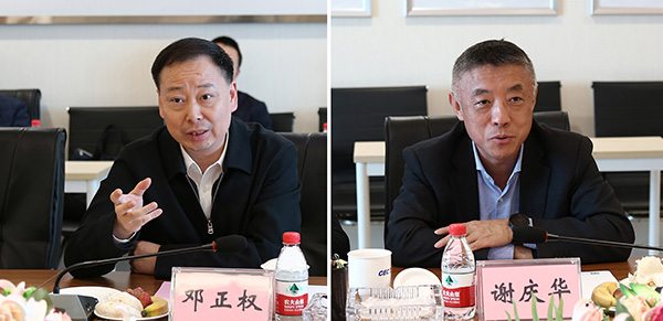 遂寧市市長(zhǎng)鄧正權(quán)、中電科技董事長(zhǎng)謝慶華在座談會(huì)上探討交流